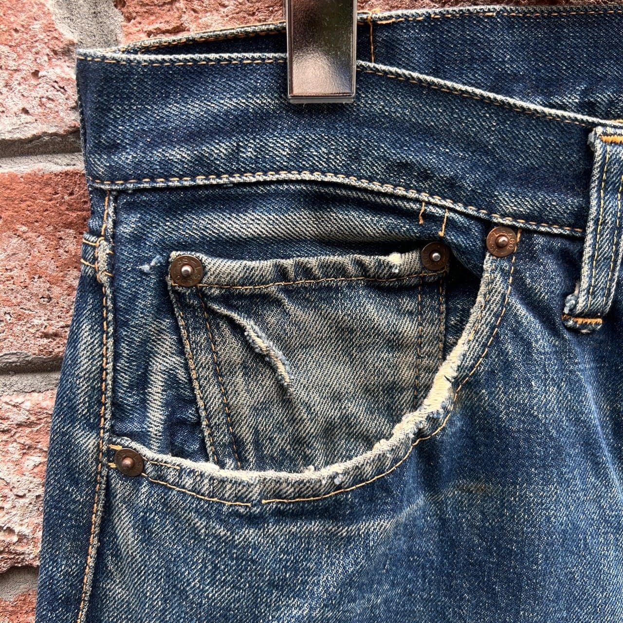 ヒップ部分にわずかにステッチ抜け、リステッチございますが、着用には問題無くあまり気にならない程度かと思います。