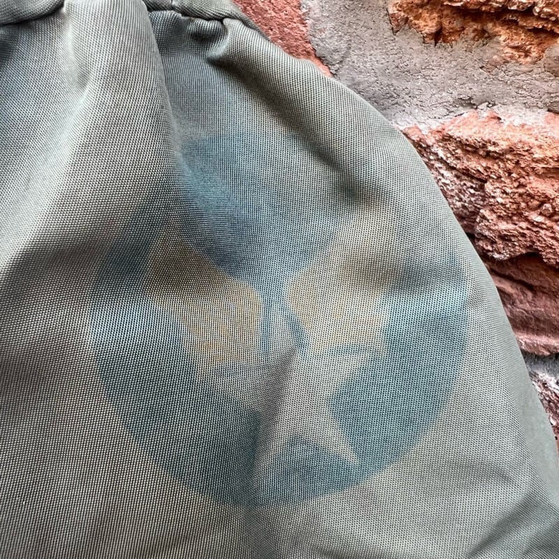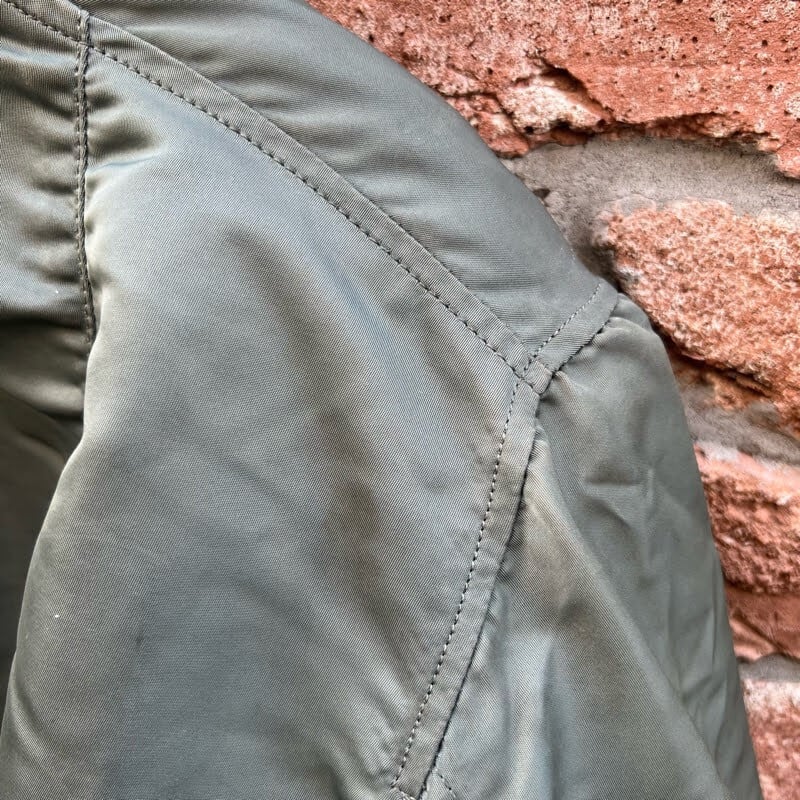セージグリーンのナイロン生地、このモデルまで付く襟ボアが特徴です。